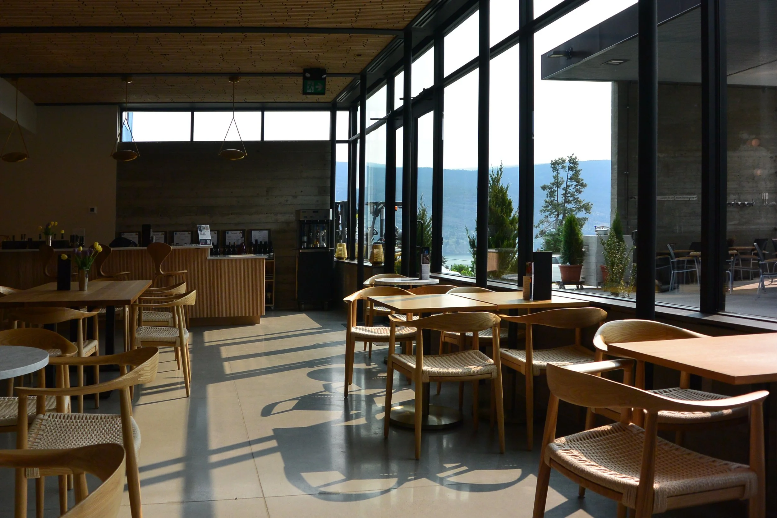 this hybrid timber and steel structure was economical to build but links the tasting experience to both interior and exterior wine production space through expansive glazing. the crush pad operation remains at the centre of the ocp experience, the foreground of the tasting room’s view behind which vineyards stretch toward the lake. in spring and summer, the crush pad will be used as a patio allowing guests to taste wine in the shade of the canopy right where grapes are brought as part of the wine-making process.